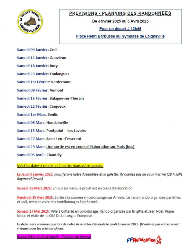 Voici le Planning de Janvier à Avril 2025.